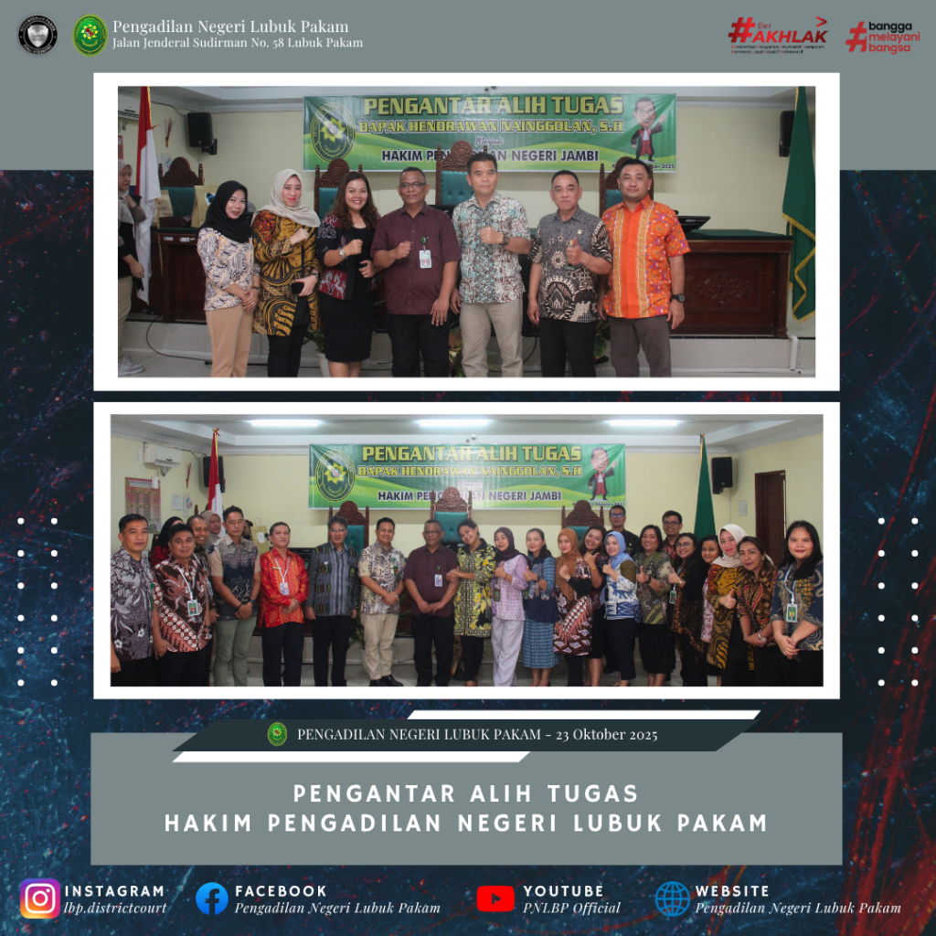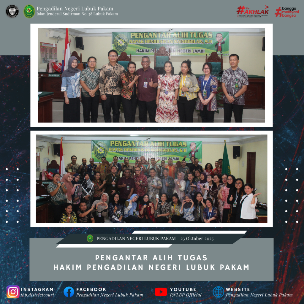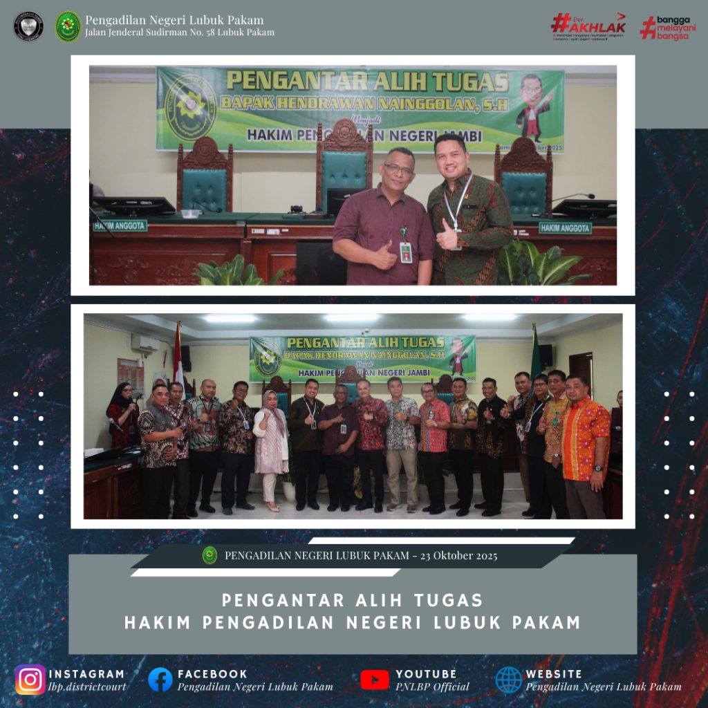 Lubuk Pakam, Oktober 2025 – Pengadilan Negeri Lubuk Pakam menggelar acara Pengantar Alih Tugas untuk Hakim Pengadilan Negeri Lubuk Pakam, Bapak Hendrawan Nainggolan, S.H., yang akan melanjutkan penugasan di Pengadilan Negeri Jambi. Acara dilaksanakan di Ruang Sidang Prof. Dr. H. M. Hatta Ali, S.H., M.H., dan berlangsung dalam suasana haru yang dipenuhi rasa kekeluargaan serta penghormatan atas pengabdian beliau selama bertugas.