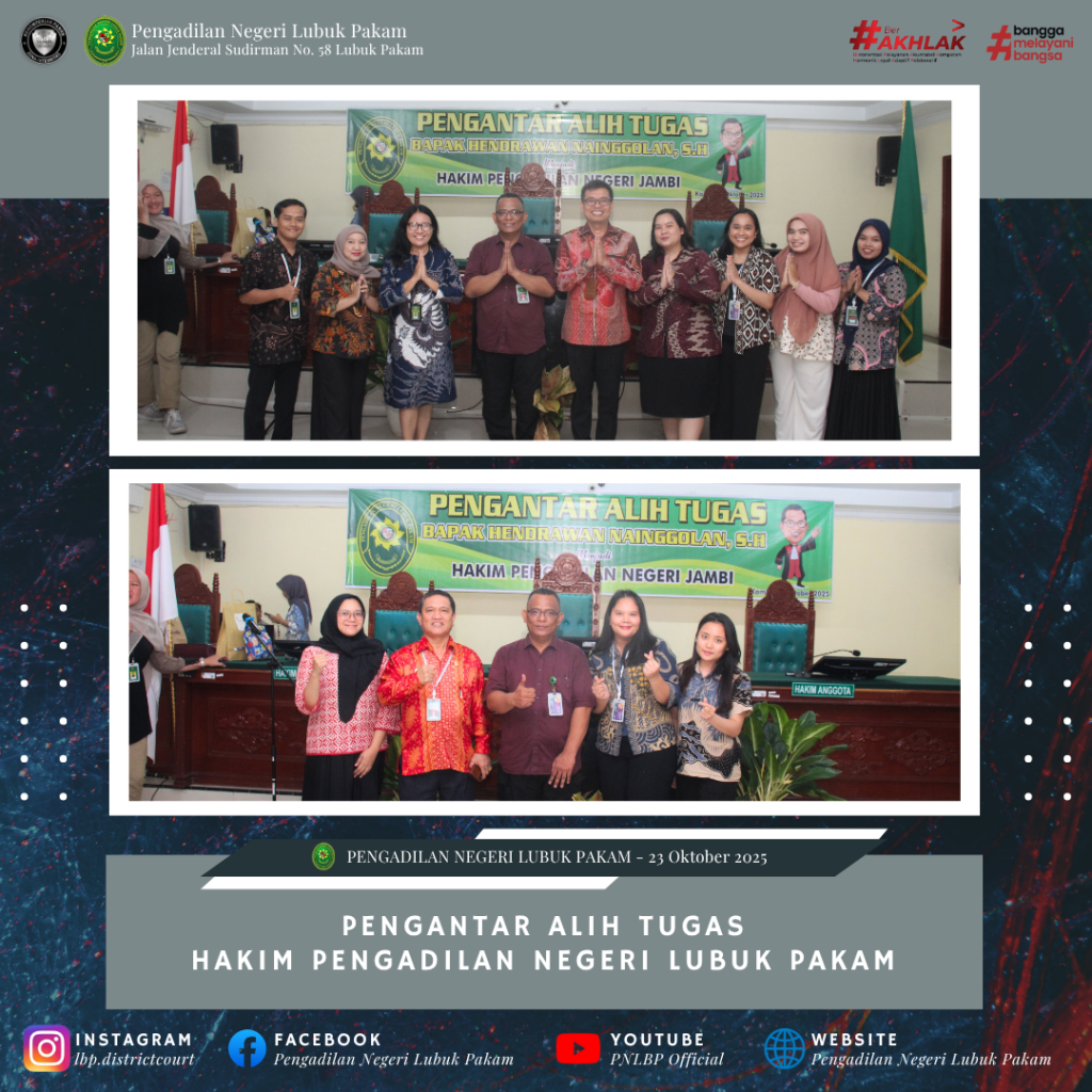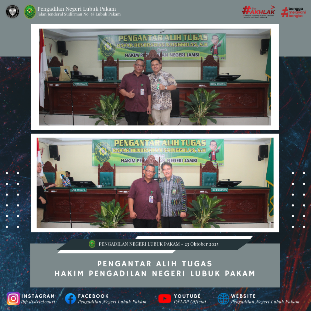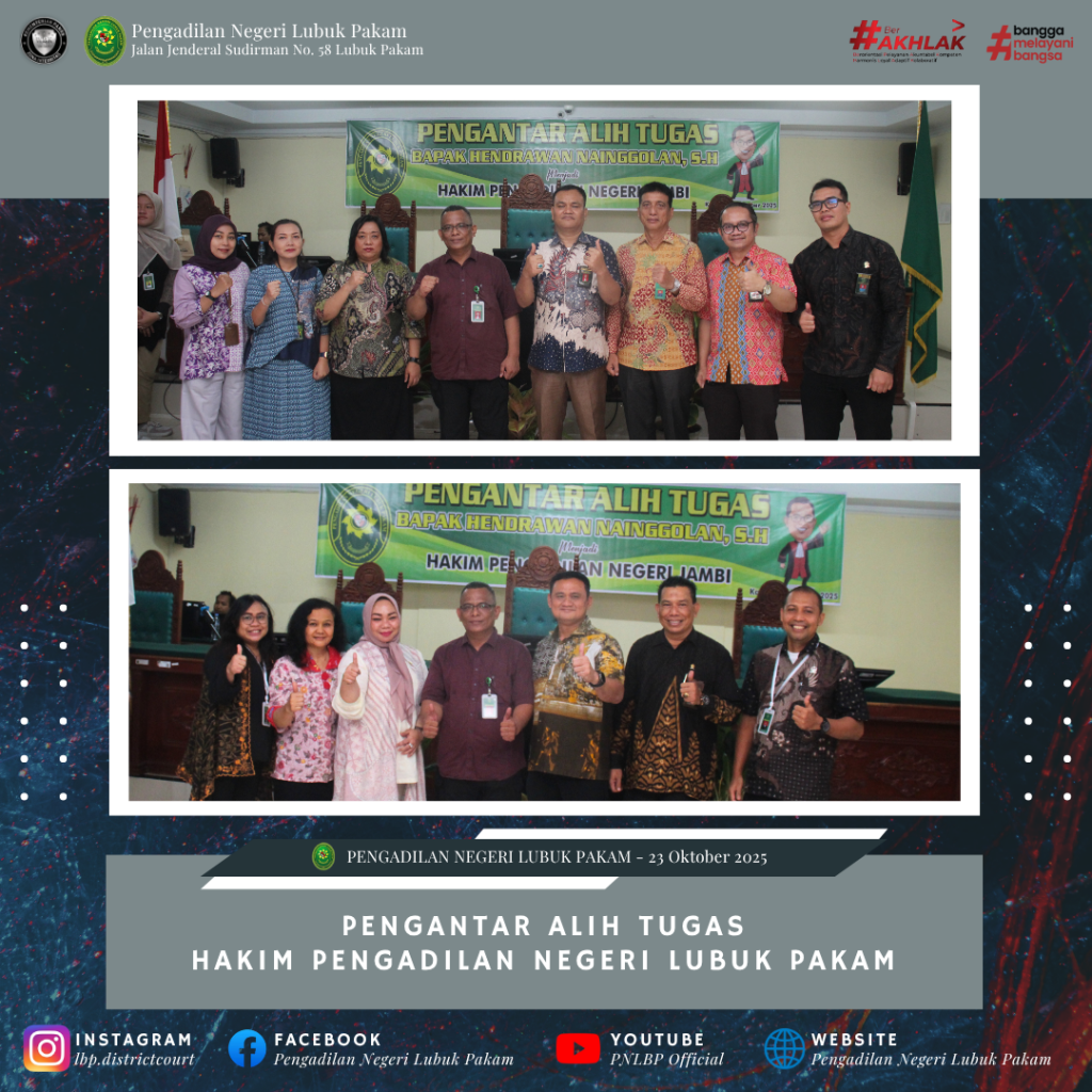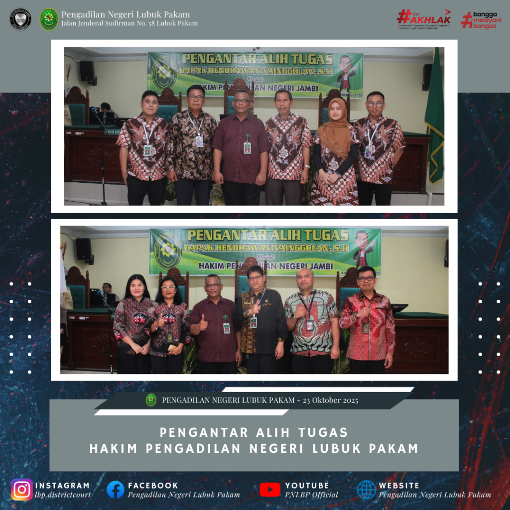 Lubuk Pakam, Oktober 2025 – Pengadilan Negeri Lubuk Pakam menggelar acara Pengantar Alih Tugas untuk Hakim Pengadilan Negeri Lubuk Pakam, Bapak Hendrawan Nainggolan, S.H., yang akan melanjutkan penugasan di Pengadilan Negeri Jambi. Acara dilaksanakan di Ruang Sidang Prof. Dr. H. M. Hatta Ali, S.H., M.H., dan berlangsung dalam suasana haru yang dipenuhi rasa kekeluargaan serta penghormatan atas pengabdian beliau selama bertugas.