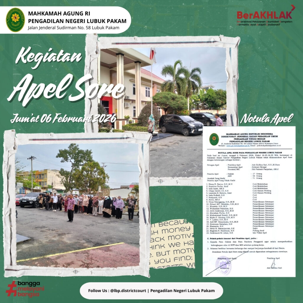 Lubuk Pakam – (06/06/2025). Menutup rangkaian aktivitas kerja minggu ini, segenap pimpinan, hakim, pejabat struktural, fungsional, serta seluruh aparatur Pengadilan Negeri (PN) Lubuk Pakam melaksanakan kegiatan rutin Apel Sore pada hari Jum’at, 06 Februari 2026. Apel dilaksanakan dengan khidmat di halaman kantor Pengadilan Negeri Lubuk Pakam.