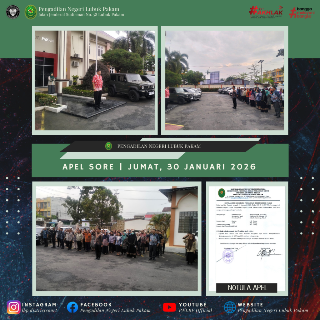 Mengakhiri rangkaian kegiatan kerja pada akhir Januari, Pengadilan Negeri Lubuk Pakam melaksanakan Apel Sore pada Jumat, 30 Januari 2026, bertempat di halaman Pengadilan Negeri Lubuk Pakam. Kegiatan ini diikuti oleh seluruh aparatur peradilan sebagai momen penutup aktivitas kerja sebelum memasuki akhir pekan.