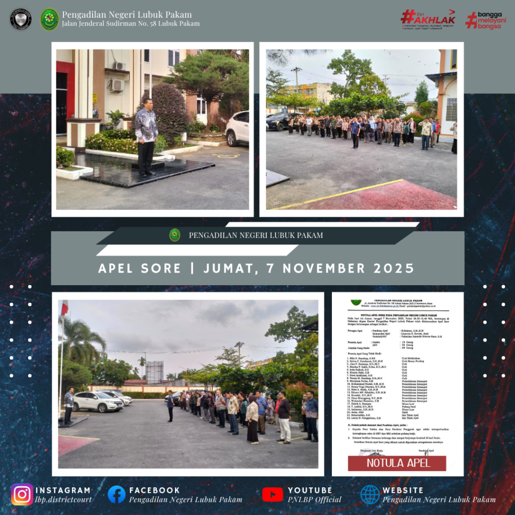 Lubuk Pakam, 7 November 2025 – Mengakhiri rangkaian kegiatan di akhir pekan, Pengadilan Negeri Lubuk Pakam melaksanakan apel sore rutin pada Jumat, 7 November 2025. Kegiatan ini diikuti oleh para hakim, pejabat struktural, fungsional, serta seluruh aparatur peradilan di lingkungan Pengadilan Negeri Lubuk Pakam.
