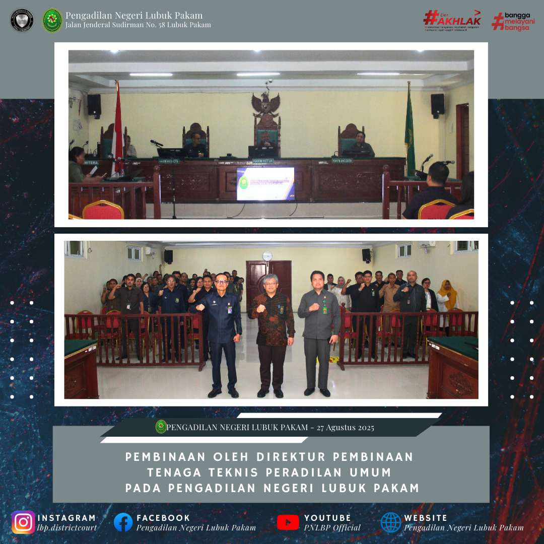 Lubuk Pakam, 27 Agustus 2025 — Pengadilan Negeri Lubuk Pakam mendapat kehormatan dengan hadirnya Direktur Pembinaan Tenaga Teknis Peradilan Umum Mahkamah Agung RI, Bapak Hasanudin,