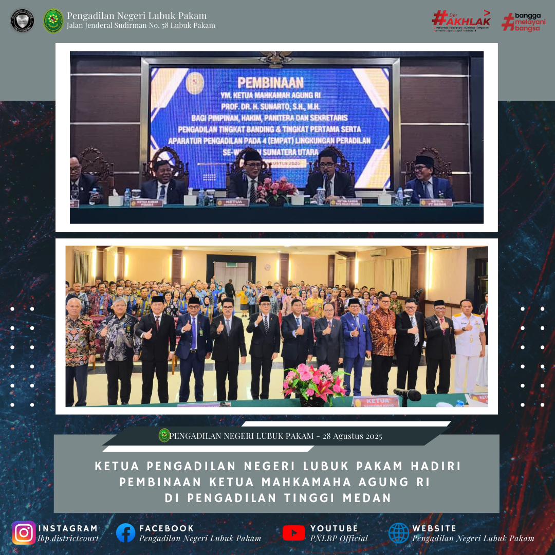 Medan, 28 Agustus 2025 — Ketua Pengadilan Negeri Lubuk Pakam, Bapak Indrawan, S.H., M.H., menghadiri kegiatan Pembinaan oleh Ketua Mahkamah Agung Republik Indonesia, Prof. Dr.