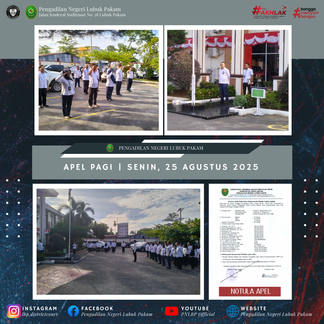 Lubuk Pakam, 25 Agustus 2025 — Senin pagi, 25 Agustus 2025, keluarga besar Pengadilan Negeri Lubuk Pakam kembali mengawali pekan dengan pelaksanaan apel pagi rutin
