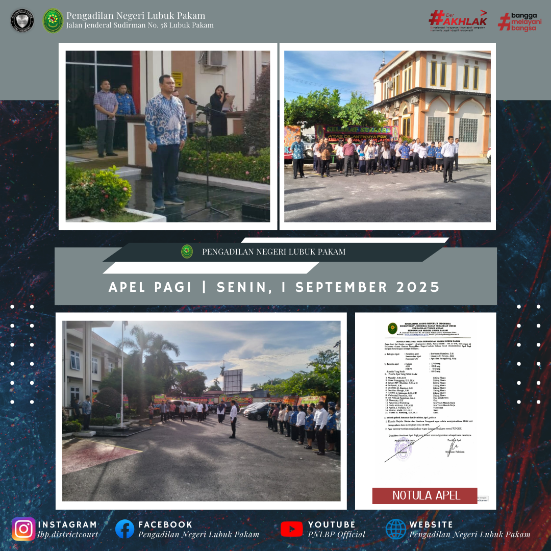 Lubuk Pakam, 1 September 2025 — Pengadilan Negeri Lubuk Pakam mengawali bulan September dengan pelaksanaan apel pagi pada Senin, 1 September 2025, di halaman kantor.