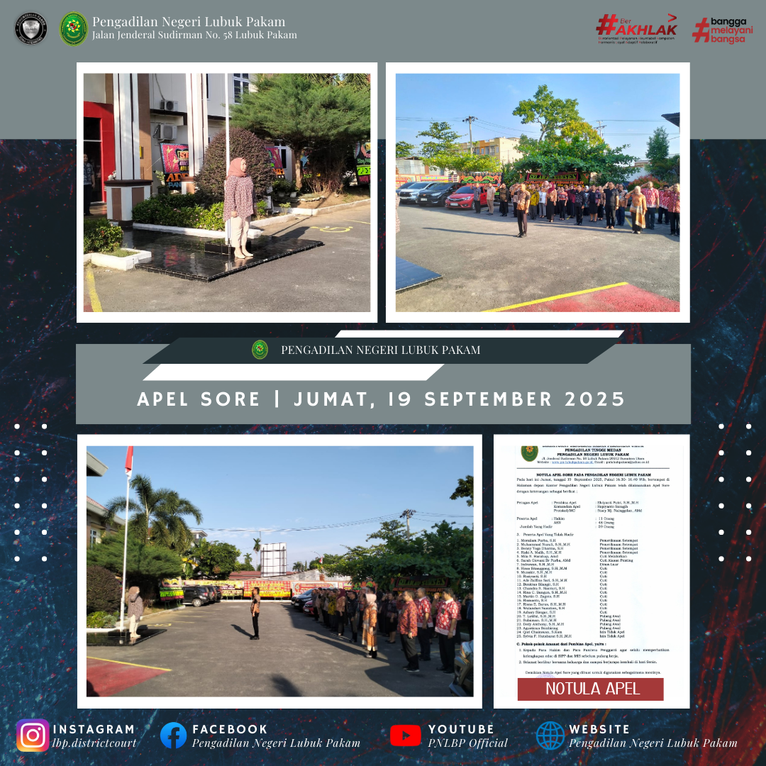 Lubuk Pakam, 26 September 2025 – Menandai akhir pekan kerja, Pengadilan Negeri Lubuk Pakam menyelenggarakan apel sore pada Jumat, 26 September 2025, di halaman kantor.