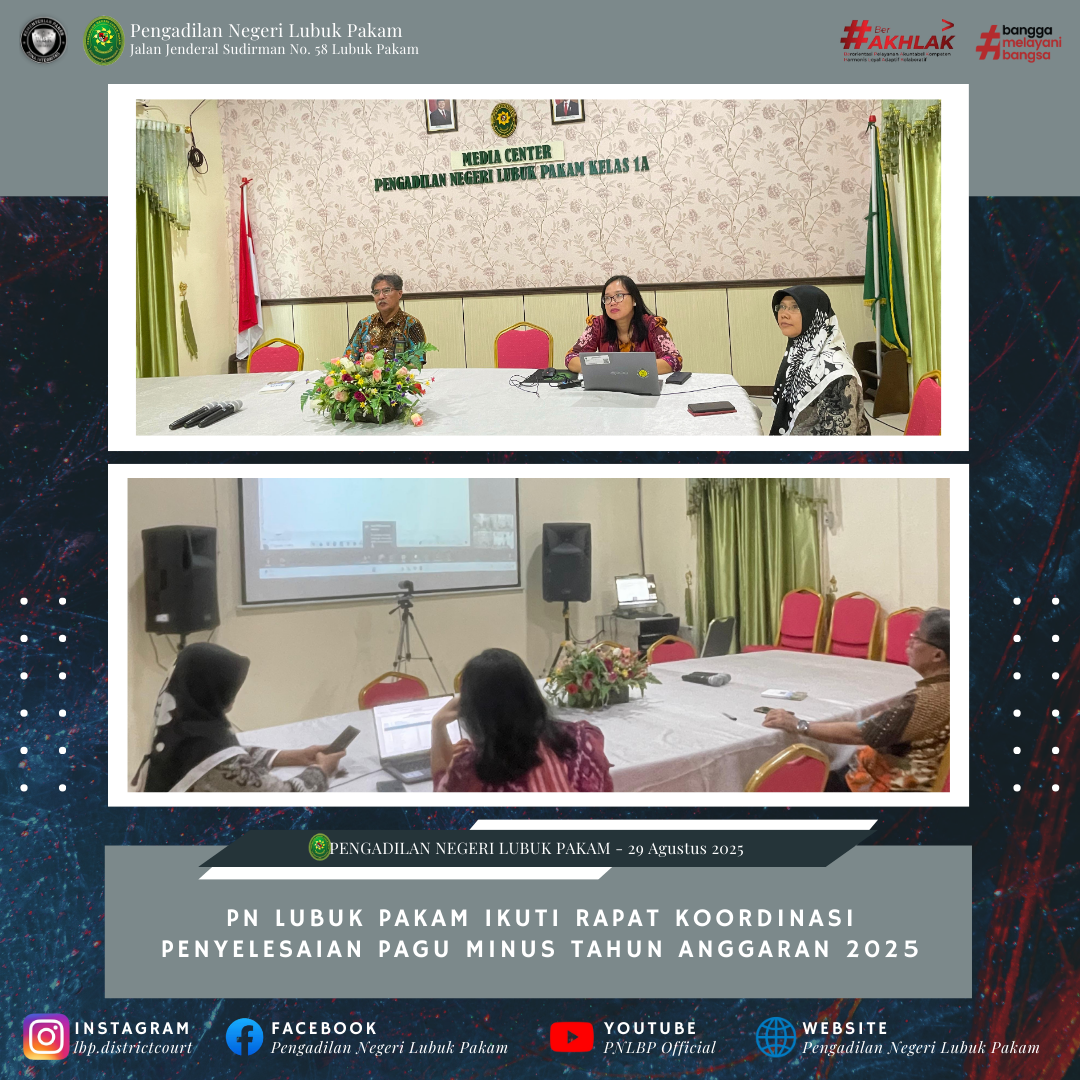 Lubuk Pakam, 29 Agustus 2025 — Pengadilan Negeri Lubuk Pakam mengikuti Rapat Koordinasi Penyelesaian Pagu Minus Pejabat Negara dan Pegawai Pemerintah dengan Perjanjian Kerja (PPPK)