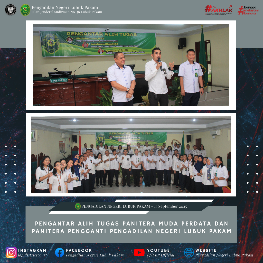 Lubuk Pakam, 15 September 2025 – Pengadilan Negeri (PN) Lubuk Pakam menyelenggarakan acara Pengantar Alih Tugas untuk tiga pegawai dalam jajaran kepaniteraan yang mendapatkan promosi