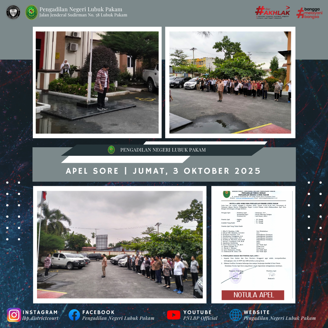 Lubuk Pakam, 3 Oktober 2025 – Pengadilan Negeri Lubuk Pakam kembali melaksanakan apel sore rutin pada Jumat, 3 Oktober 2025, sebagai bagian dari budaya kerja