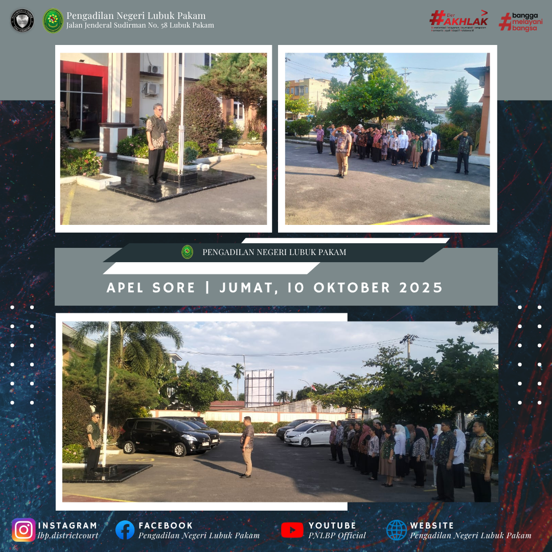 Lubuk Pakam, 10 Oktober 2025 – Pengadilan Negeri Lubuk Pakam melaksanakan apel sore rutin pada Jumat, 10 Oktober 2025, di halaman kantor sebagai penutup rangkaian