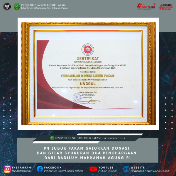 In Artikel Terkini Comment off Pengadilan Negeri Lubuk Pakam Raih Dua Penghargaan dari Ditjen Badilum Mahkamah Agung RI