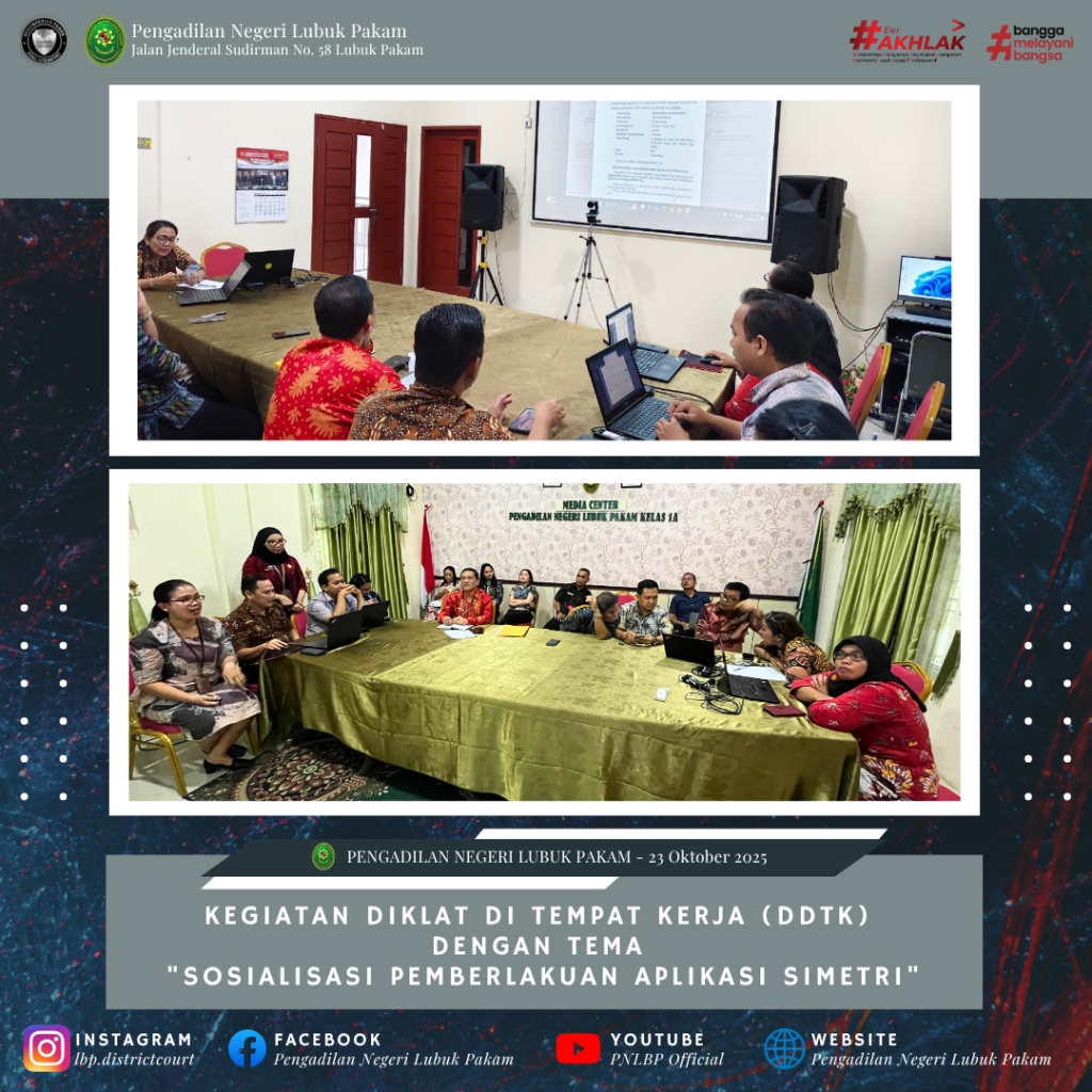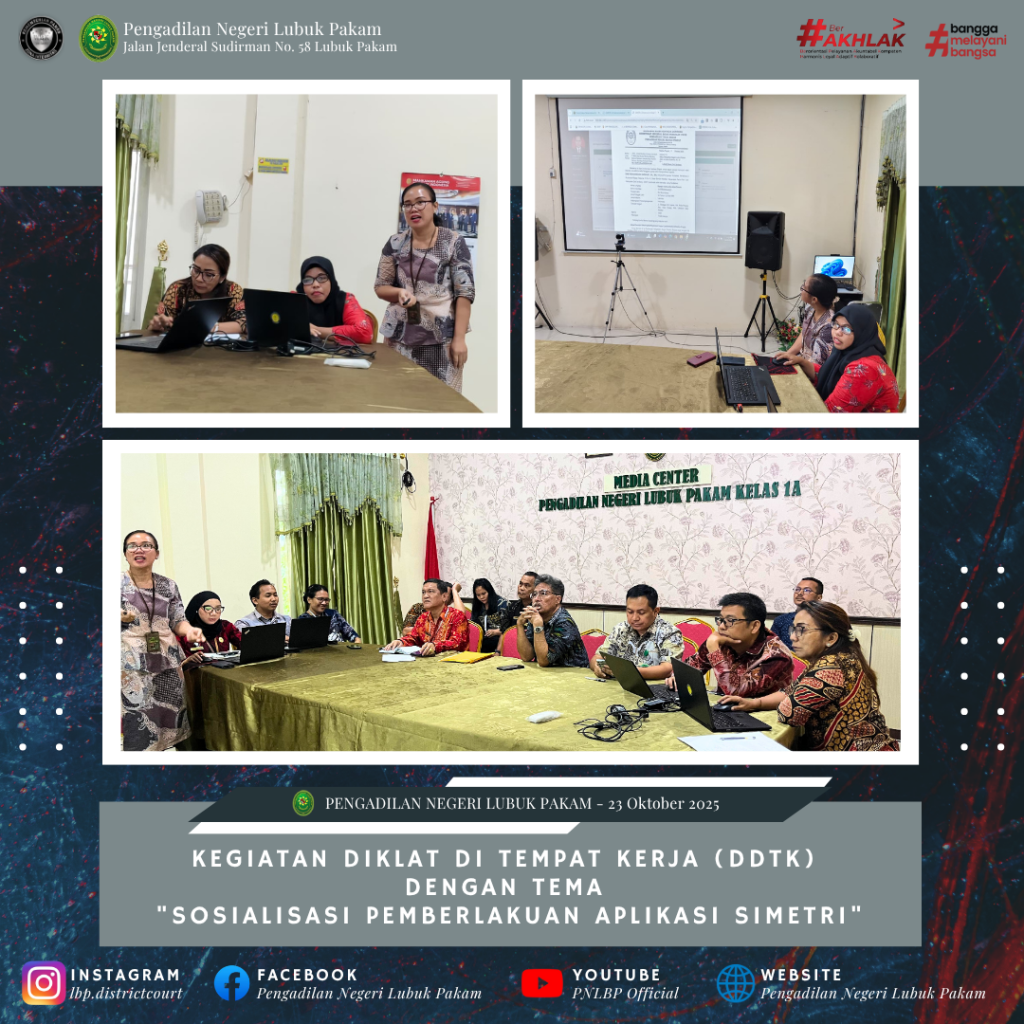 Lubuk Pakam, 23 Oktober 2025 – Pengadilan Negeri Lubuk Pakam melaksanakan Diklat di Tempat Kerja (DDTK) dengan tema “Sosialisasi Pemberlakuan Aplikasi SIMETRI” yang berlangsung di Ruang Media Center. Kegiatan ini diikuti oleh pejabat struktural dan petugas Pelayanan Terpadu Satu Pintu (PTSP) sebagai langkah strategis dalam mendukung transformasi digital dan peningkatan kualitas pelayanan publik.