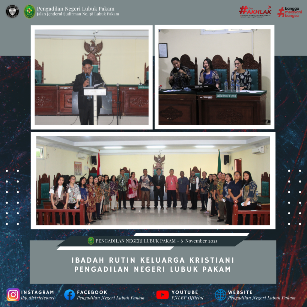 Lubuk Pakam, 6 November 2025 – Keluarga besar Pengadilan Negeri Lubuk Pakam kembali melaksanakan ibadah rutin bagi pegawai yang beragama Kristen, bertempat di Ruang Sidang Utama Prof. Dr. H. M. Hatta Ali, S.H., M.H. Kegiatan yang berlangsung khidmat dan penuh sukacita ini menjadi sarana pembinaan rohani sekaligus mempererat kebersamaan antarwarga peradilan.