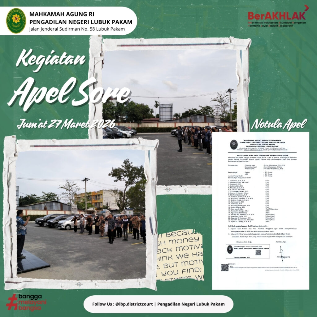 LUBUK PAKAM – Menutup rangkaian tugas persidangan dan pelayanan hukum pada pekan ini, Pengadilan Negeri Lubuk Pakam kembali melaksanakan kegiatan rutin Apel Sore pada hari Jum’at, 27 Maret 2026. Kegiatan yang dilangsungkan di halaman gedung Pengadilan Negeri Lubuk Pakam ini diikuti secara tertib oleh seluruh jajaran Hakim, Pejabat Struktural dan Fungsional, serta seluruh staf dan pegawai.