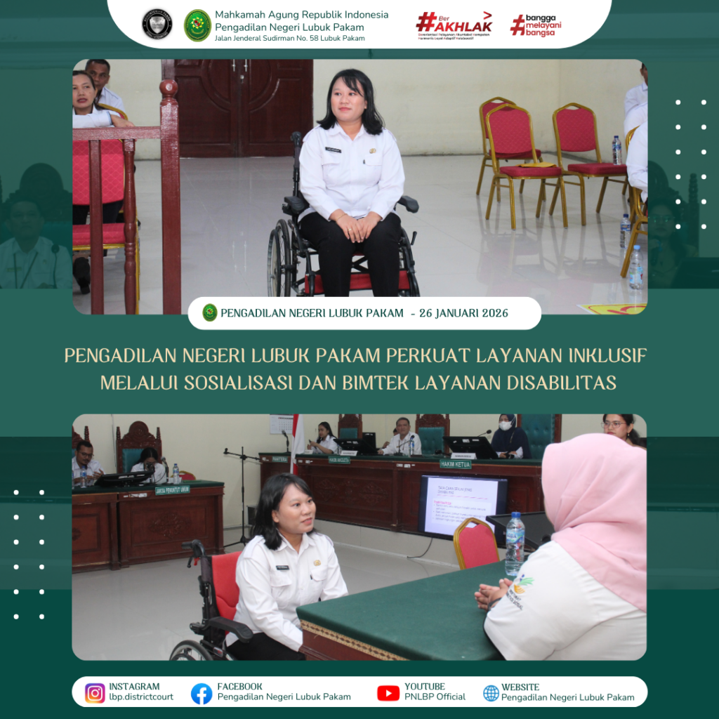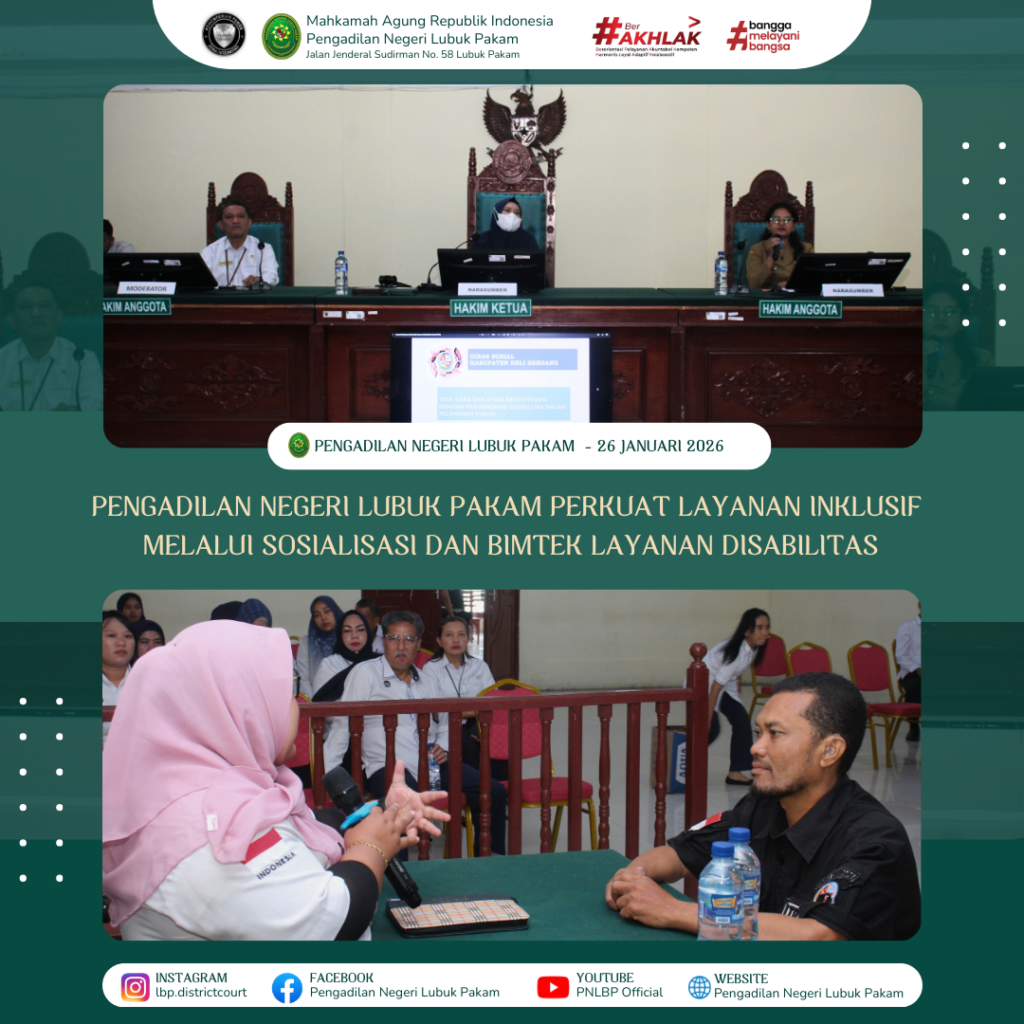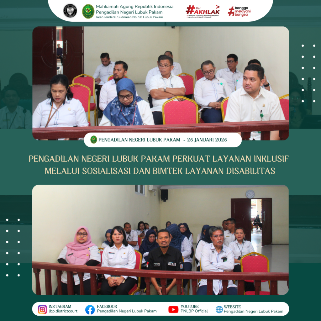 Lubuk Pakam, 26 Januari 2026 – Pengadilan Negeri Lubuk Pakam melaksanakan kegiatan Sosialisasi dan Bimbingan Teknis (Bimtek) Internal Layanan Disabilitas pada Senin, 26 Januari 2026, mulai pukul 08.30 WIB hingga selesai, bertempat di lingkungan Pengadilan Negeri Lubuk Pakam. Kegiatan ini diikuti oleh seluruh jajaran aparatur Pengadilan Negeri Lubuk Pakam.