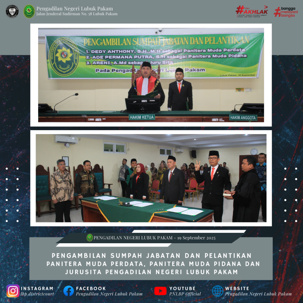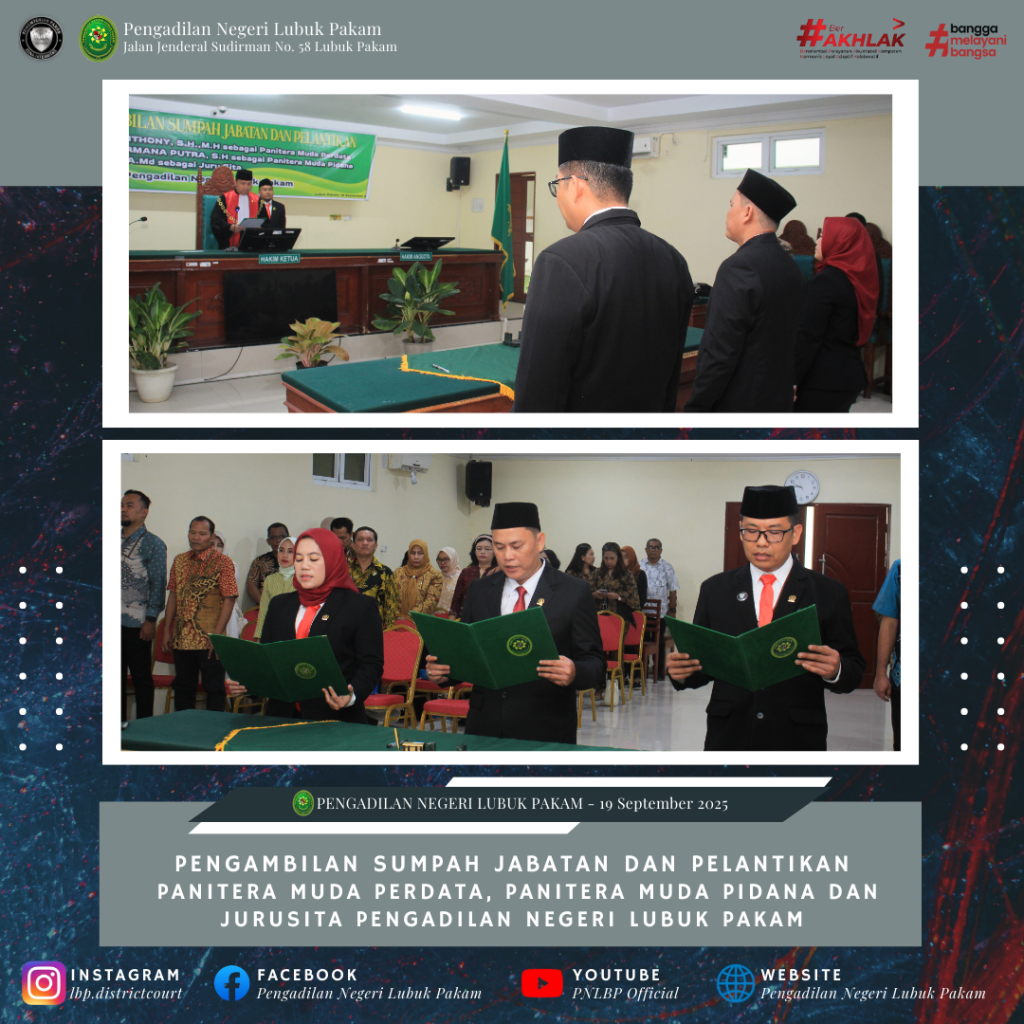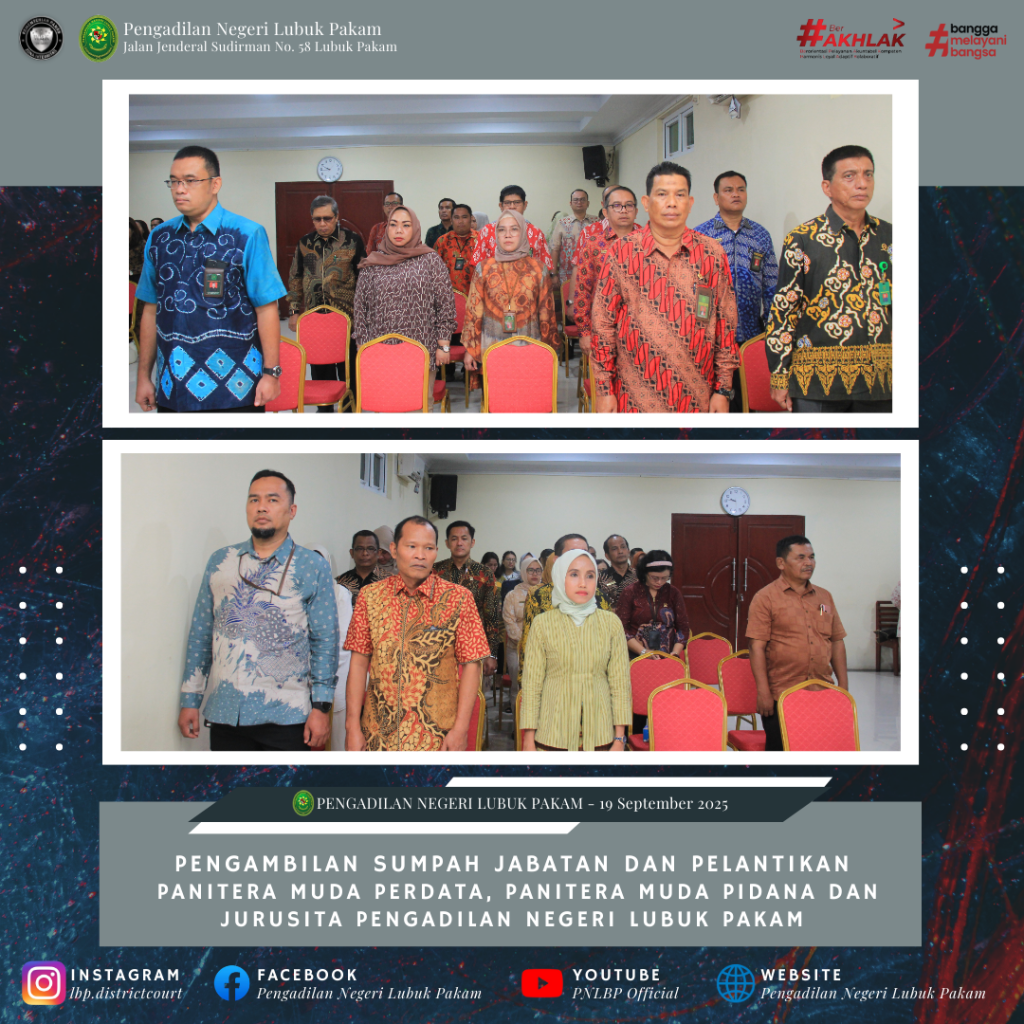 Lubuk Pakam, 19 September 2025 — Pengadilan Negeri Lubuk Pakam menggelar Upacara Pengambilan Sumpah dan Pelantikan tiga pejabat kepaniteraan baru pada Jumat, 19 September 2025. Acara berlangsung khidmat di Ruang Sidang Prof. Dr. H. M. Hatta Ali, S.H., M.H., Pengadilan Negeri Lubuk Pakam, dihadiri oleh jajaran hakim, pejabat struktural dan fungsional, serta seluruh keluarga besar Pengadilan Negeri Lubuk Pakam.