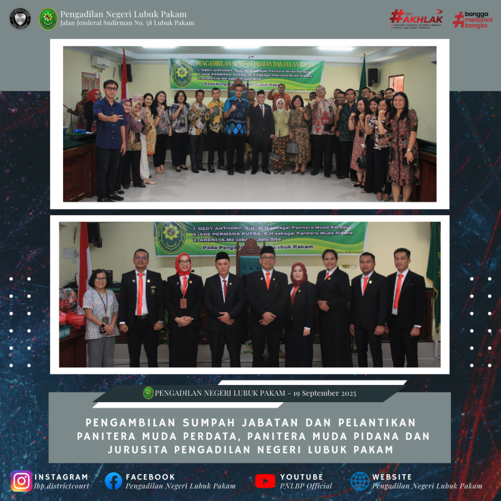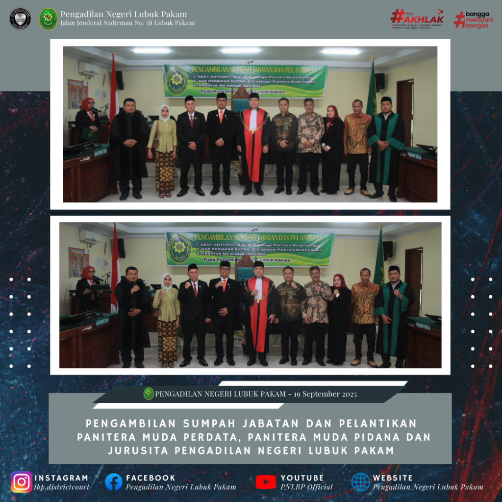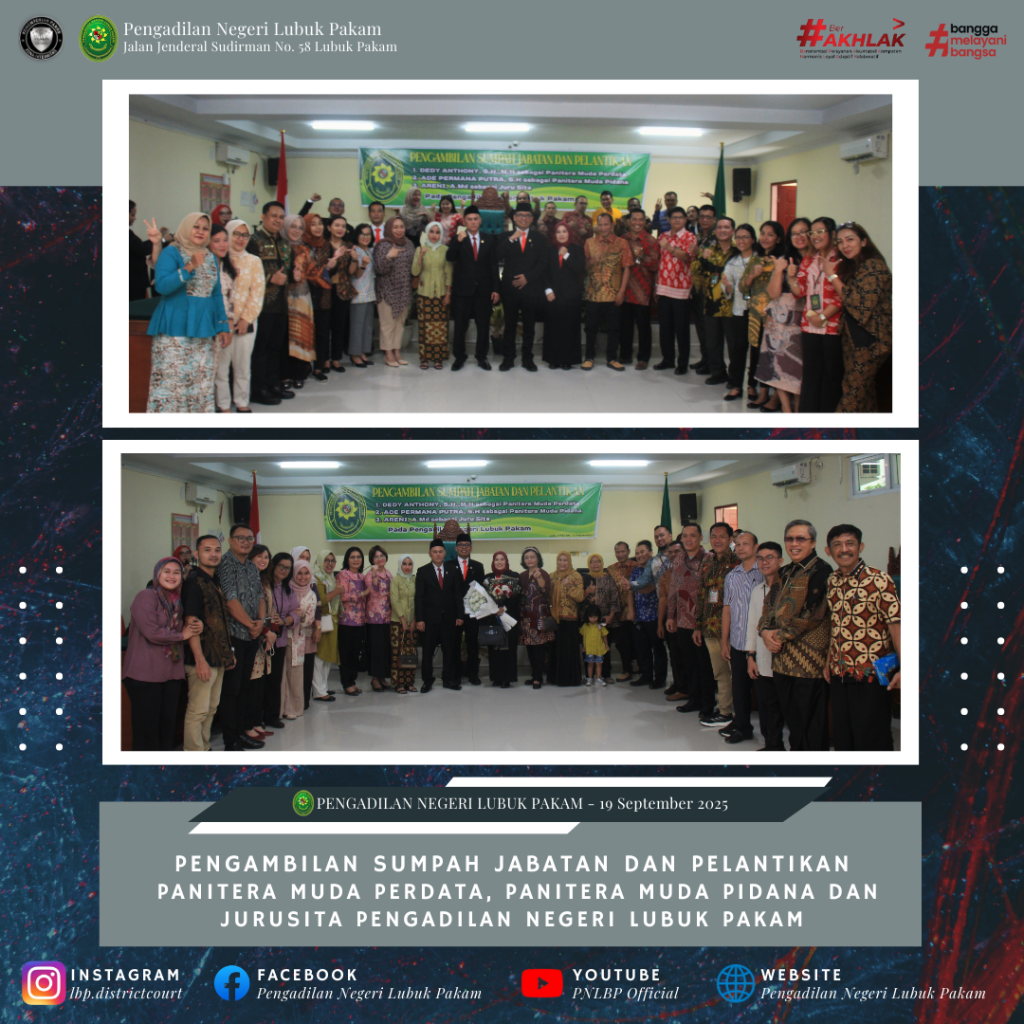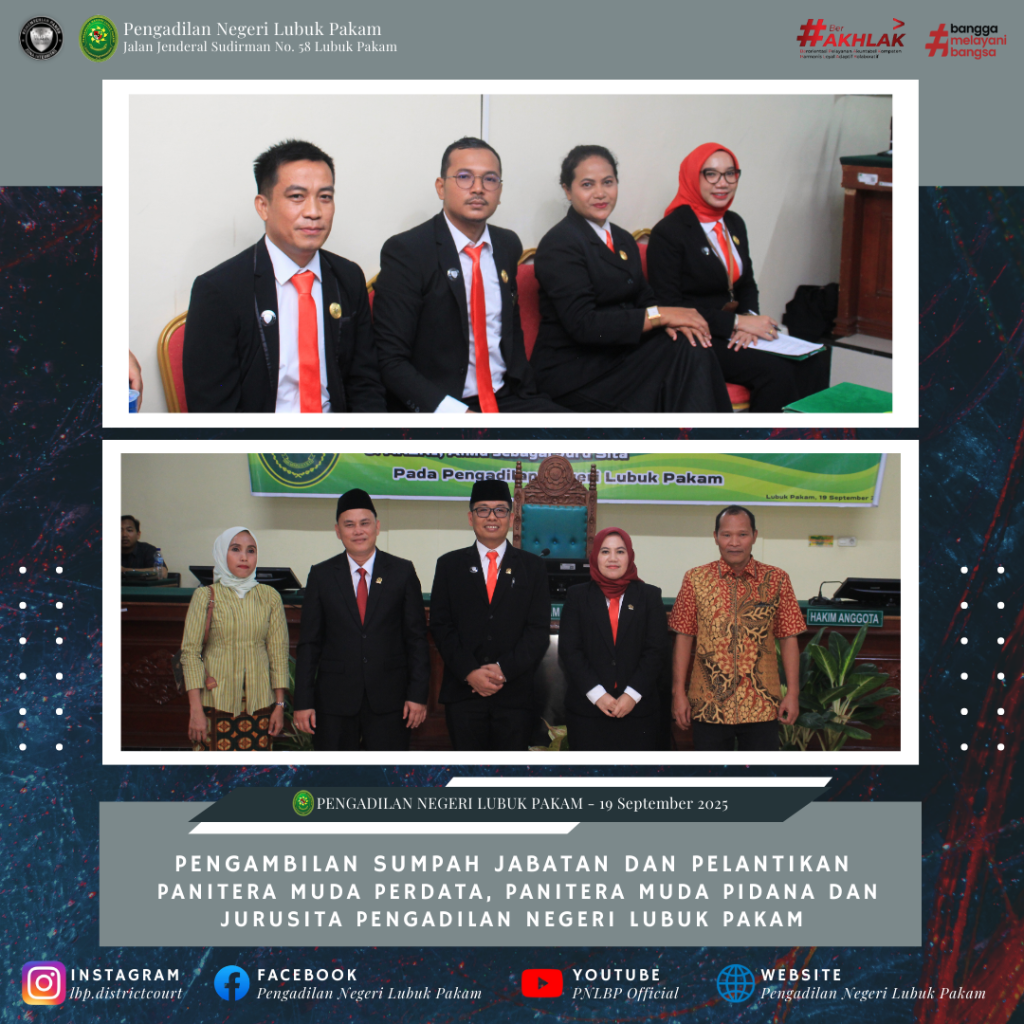 Lubuk Pakam, 19 September 2025 — Pengadilan Negeri Lubuk Pakam menggelar Upacara Pengambilan Sumpah dan Pelantikan tiga pejabat kepaniteraan baru pada Jumat, 19 September 2025. Acara berlangsung khidmat di Ruang Sidang Prof. Dr. H. M. Hatta Ali, S.H., M.H., Pengadilan Negeri Lubuk Pakam, dihadiri oleh jajaran hakim, pejabat struktural dan fungsional, serta seluruh keluarga besar Pengadilan Negeri Lubuk Pakam.