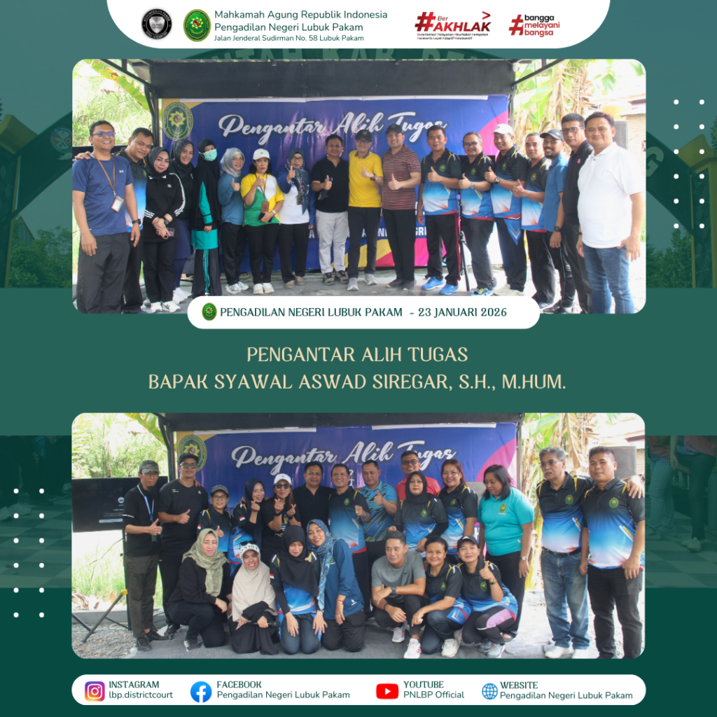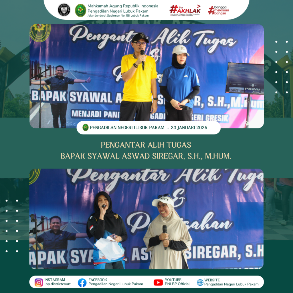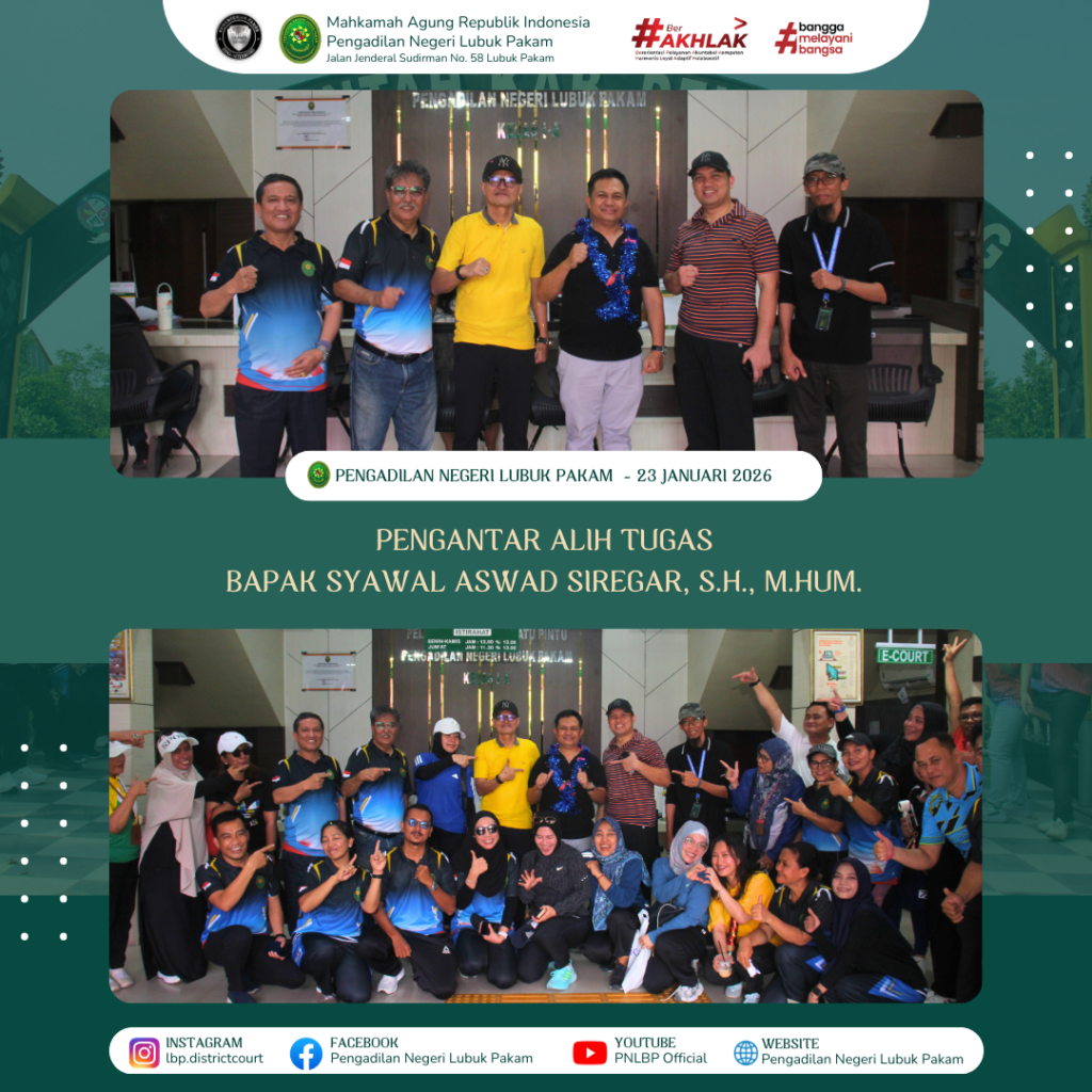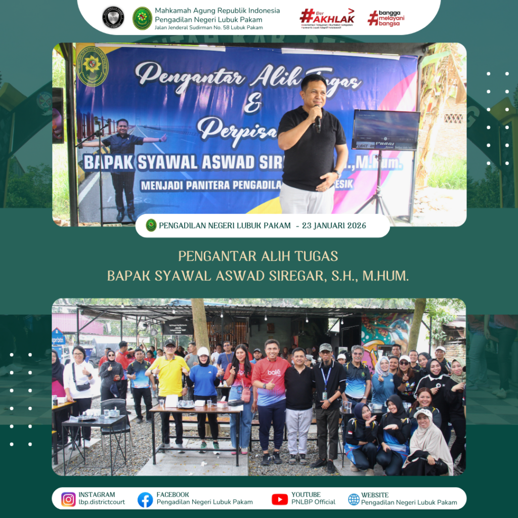 Pengadilan Negeri Lubuk Pakam menyampaikan doa dan harapan terbaik agar Bapak Syawal Aswad Siregar, S.H., M.Hum. senantiasa diberikan kelancaran dan kesuksesan dalam mengemban amanah baru sebagai Panitera Pengadilan Negeri Gresik Kelas IA, serta dapat terus memberikan kontribusi terbaik bagi institusi peradilan.