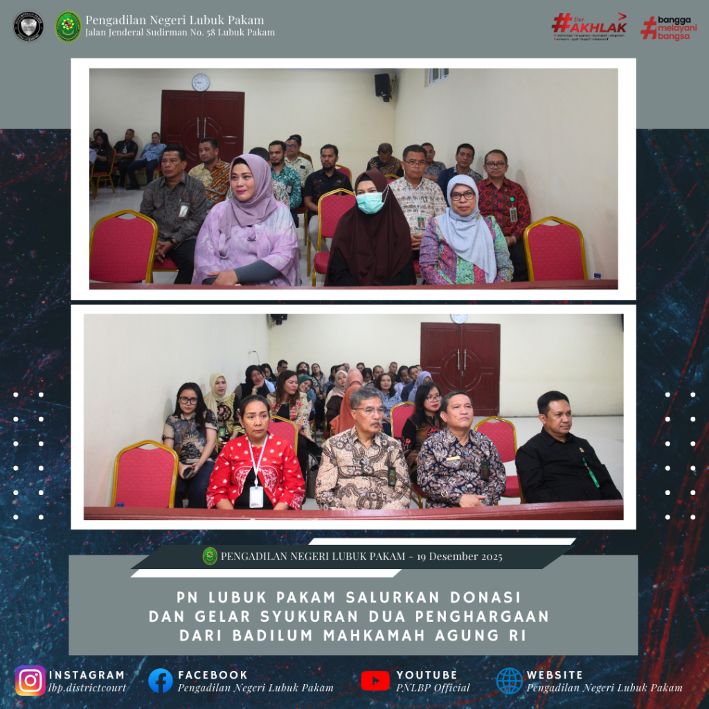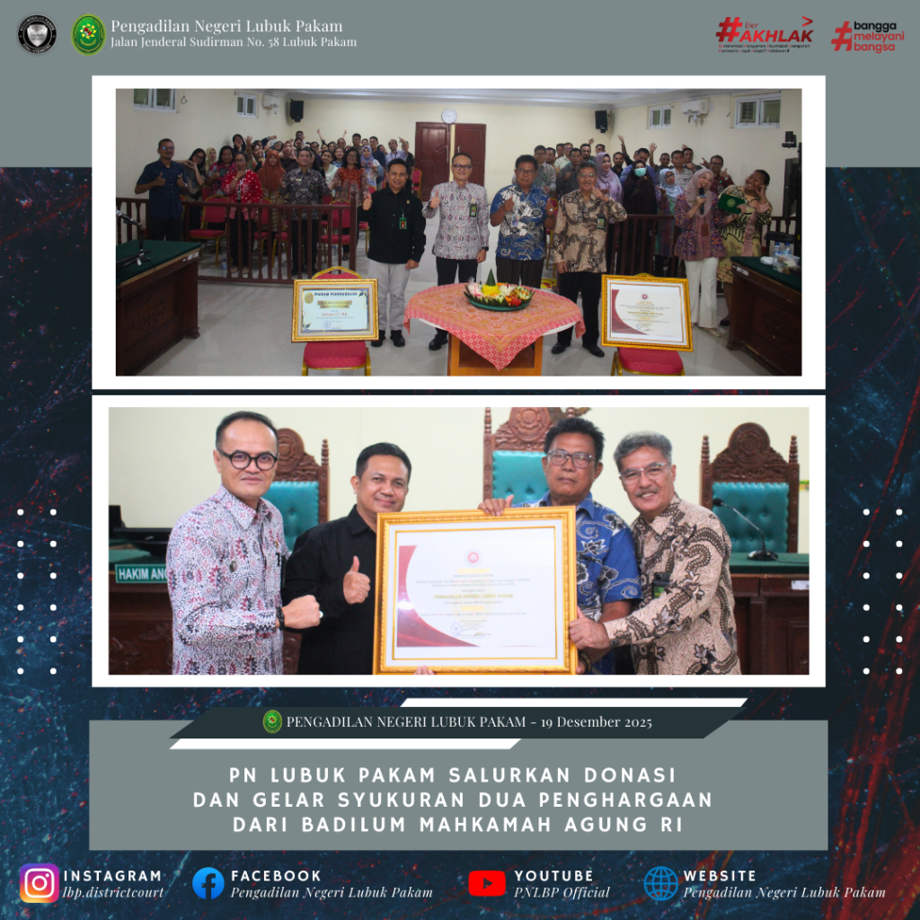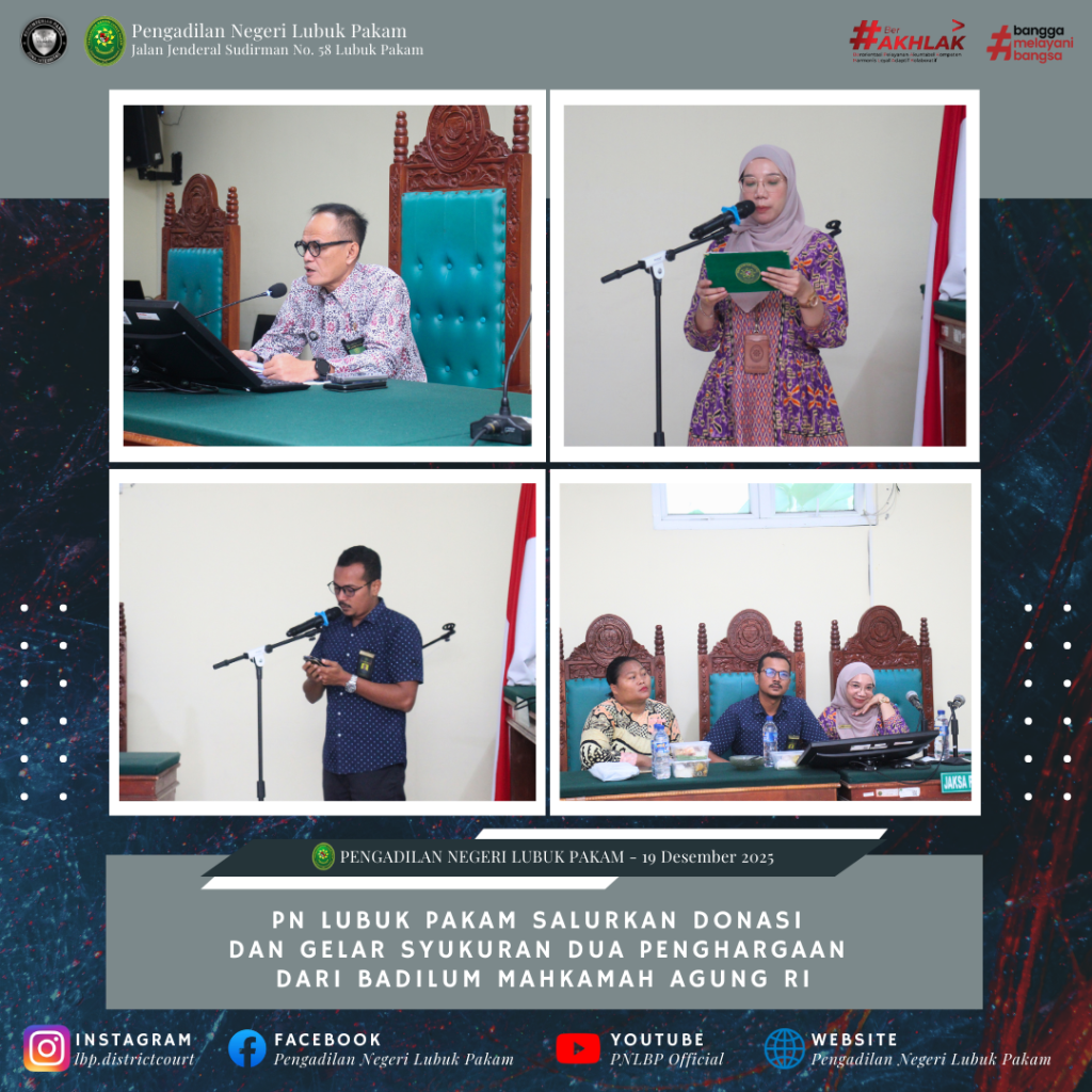 Lubuk Pakam, 19 Desember 2025 — Pengadilan Negeri Lubuk Pakam melaksanakan kegiatan penyerahan donasi kepada keluarga besar Pengadilan Negeri Lubuk Pakam yang terdampak musibah banjir, yang dirangkaikan dengan syukuran atas capaian penghargaan nasional Tahun 2025, pada Jumat (19/12/2025) bertempat di Ruang Sidang Utama Pengadilan Negeri Lubuk Pakam.