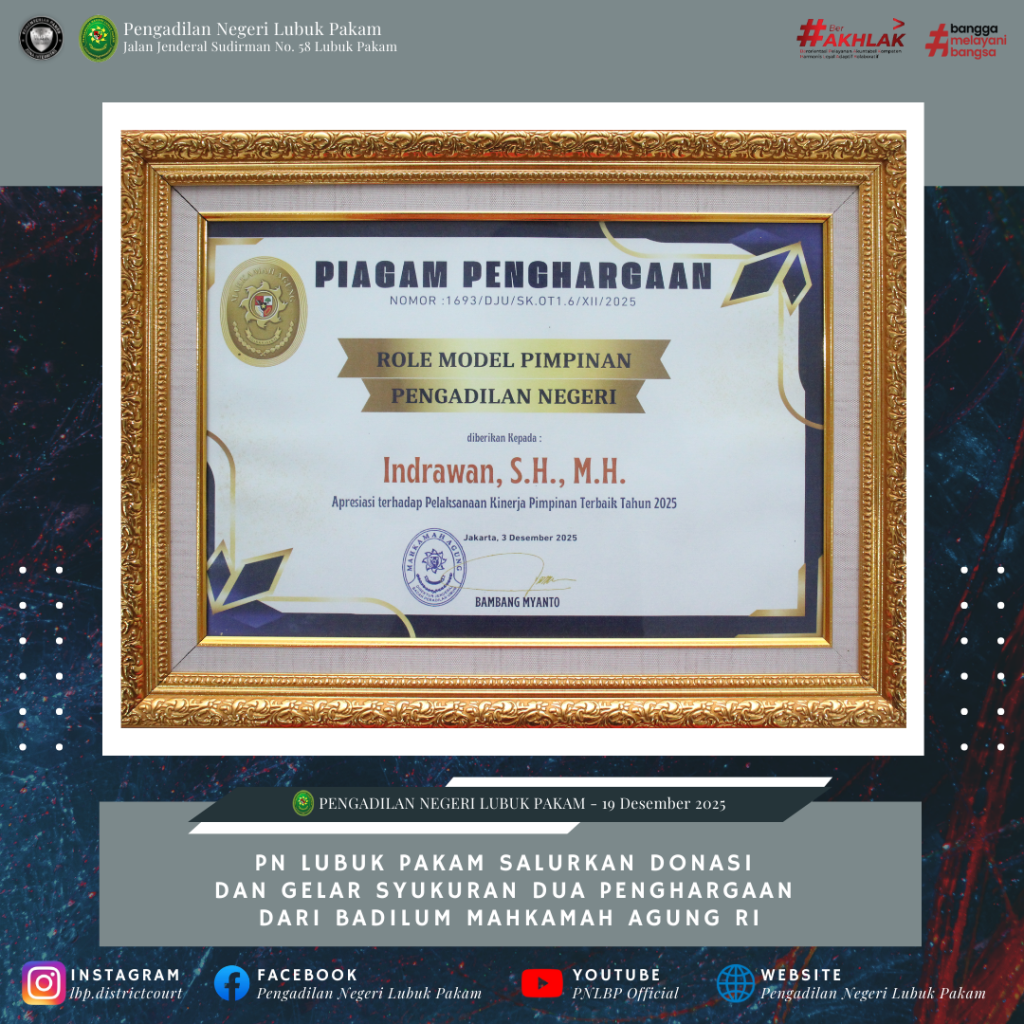 Selain capaian institusional tersebut, Ketua Pengadilan Negeri Lubuk Pakam, Bapak Indrawan, S.H., M.H., juga menerima penghargaan sebagai Role Model Pimpinan Pengadilan Negeri, sebagai bentuk pengakuan atas kepemimpinan yang berintegritas, visioner, dan mampu mendorong peningkatan kinerja satuan kerja secara berkelanjutan. Penghargaan tersebut diberikan oleh Direktorat Jenderal Badan Peradilan Umum Mahkamah Agung Republik Indonesia dalam rangkaian Penyerahan Penghargaan Abhinaya Upangga Wisesa Tahun 2025.