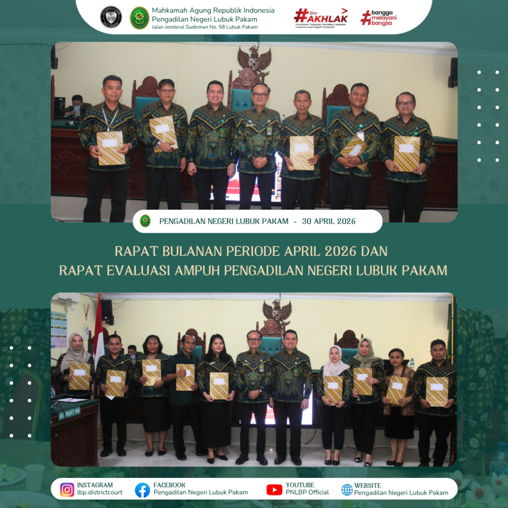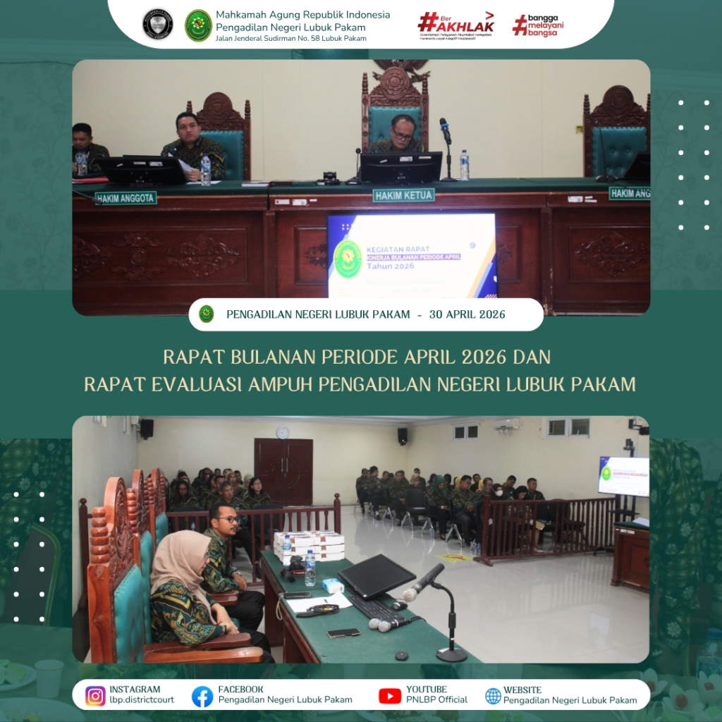 Lubuk Pakam – Pengadilan Negeri Lubuk Pakam kembali menggelar agenda rutin Rapat Bulanan Periode April 2026 yang dirangkaikan dengan Rapat Evaluasi AMPUH (Sertifikasi Mutu Peradilan Unggul dan Tangguh) pada Kamis 30 April 2026. Bertempat di Ruang Sidang Utama Prof Dr H Muhammad Hatta Ali SH MH, kegiatan ini bertujuan untuk membedah capaian kinerja sekaligus memastikan standarisasi pelayanan tetap terjaga sesuai koridor yang ditetapkan.