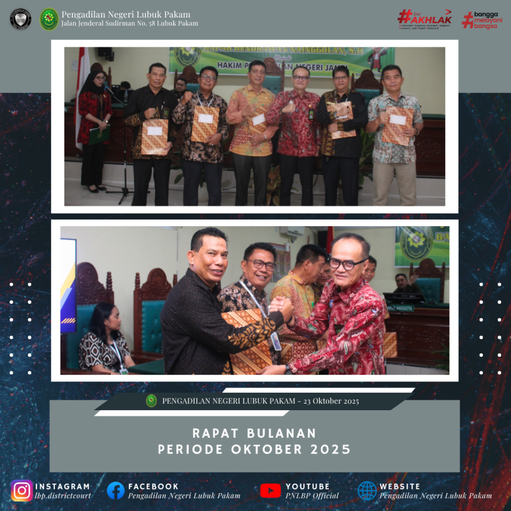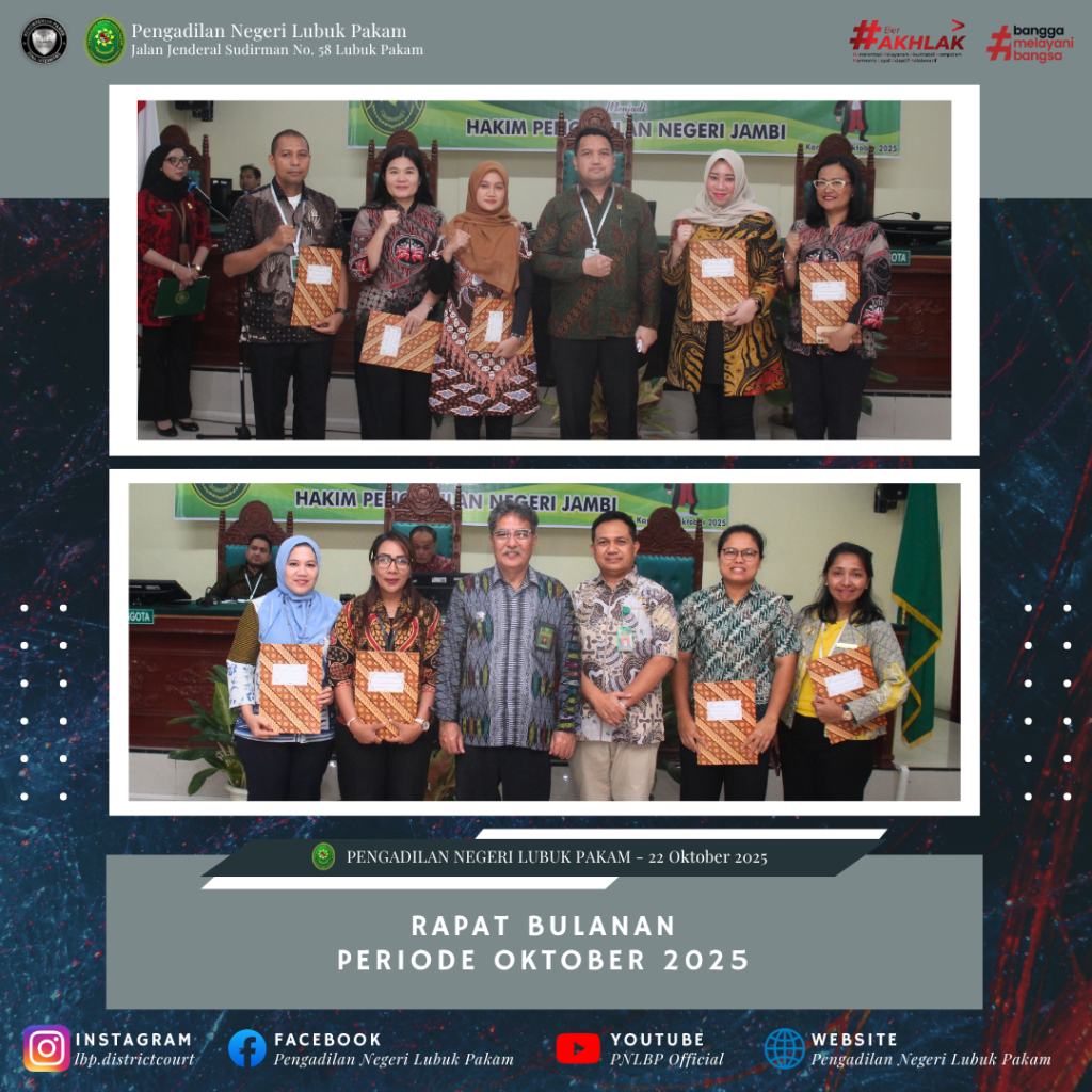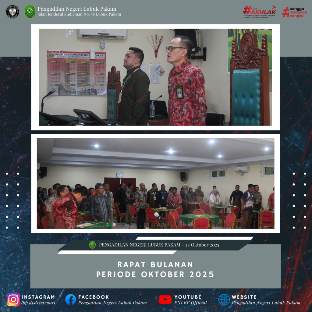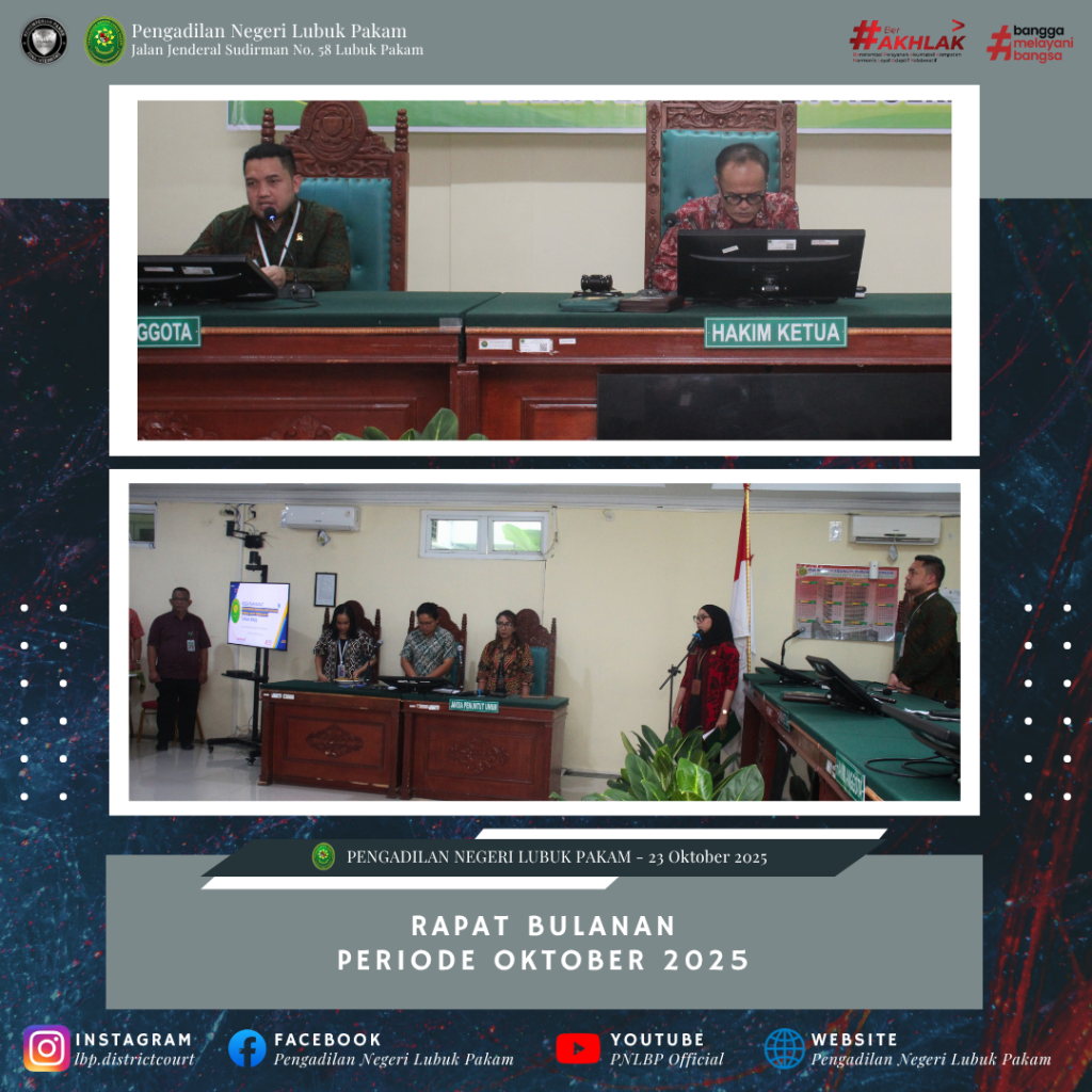 Lubuk Pakam, Oktober 2025 – Pengadilan Negeri Lubuk Pakam menyelenggarakan rapat bulanan periode Oktober 2025 di Ruang Sidang Prof. Dr. H. M. Hatta Ali, S.H., M.H., dengan dihadiri oleh para hakim, pejabat struktural dan fungsional, aparatur kepaniteraan dan kesekretariatan. Rapat ini dipimpin oleh Ketua Pengadilan Negeri Lubuk Pakam, Bapak Indrawan, S.H., M.H.