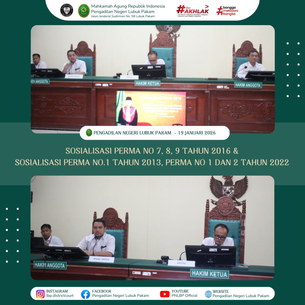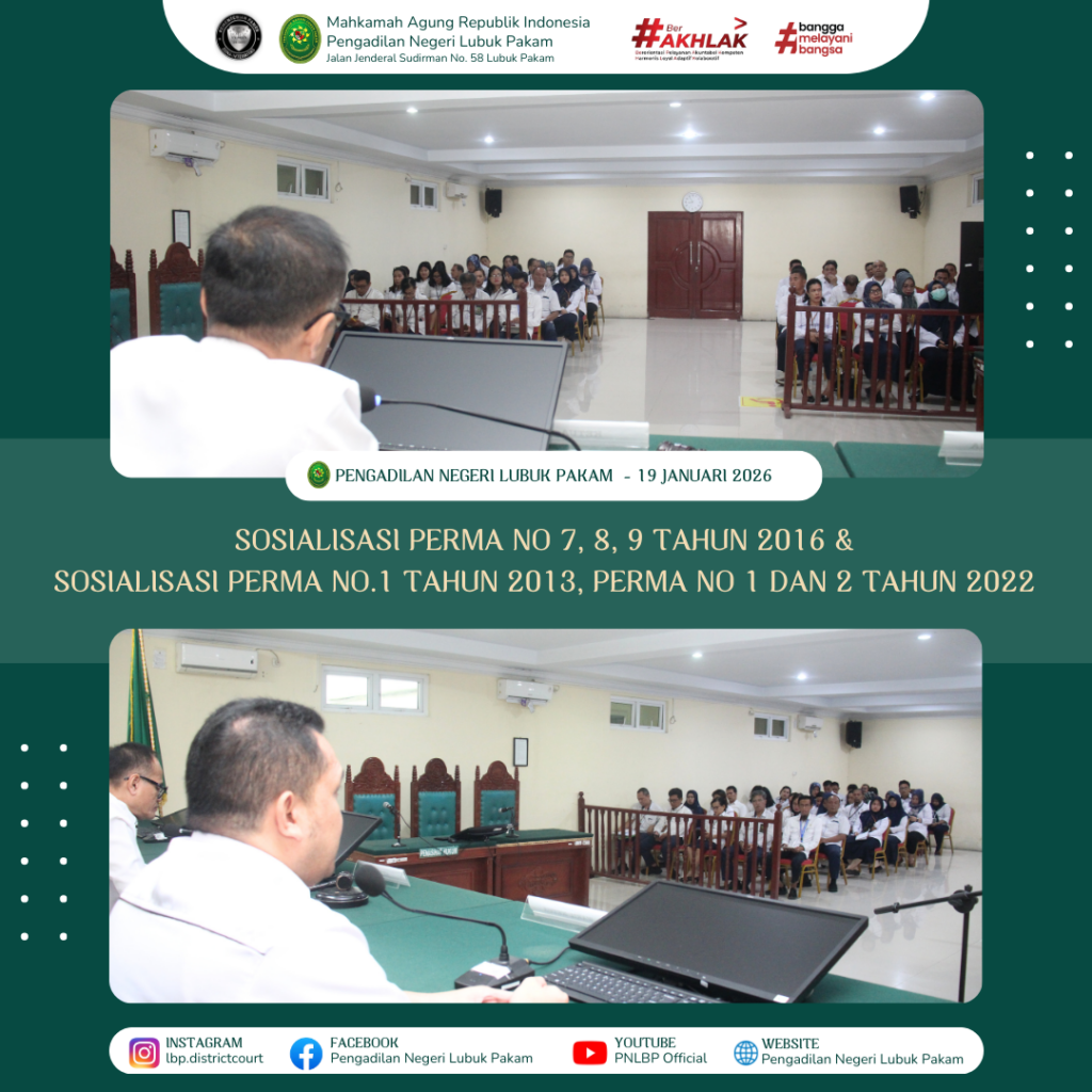 Lubuk Pakam, 19 Januari 2026 – Dalam rangka meningkatkan pemahaman dan keseragaman penerapan regulasi di lingkungan peradilan, Pengadilan Negeri Lubuk Pakam melaksanakan Sosialisasi Peraturan Mahkamah Agung (PERMA) pada Senin, 19 Januari 2026, yang dilaksanakan di lingkungan Pengadilan Negeri Lubuk Pakam.