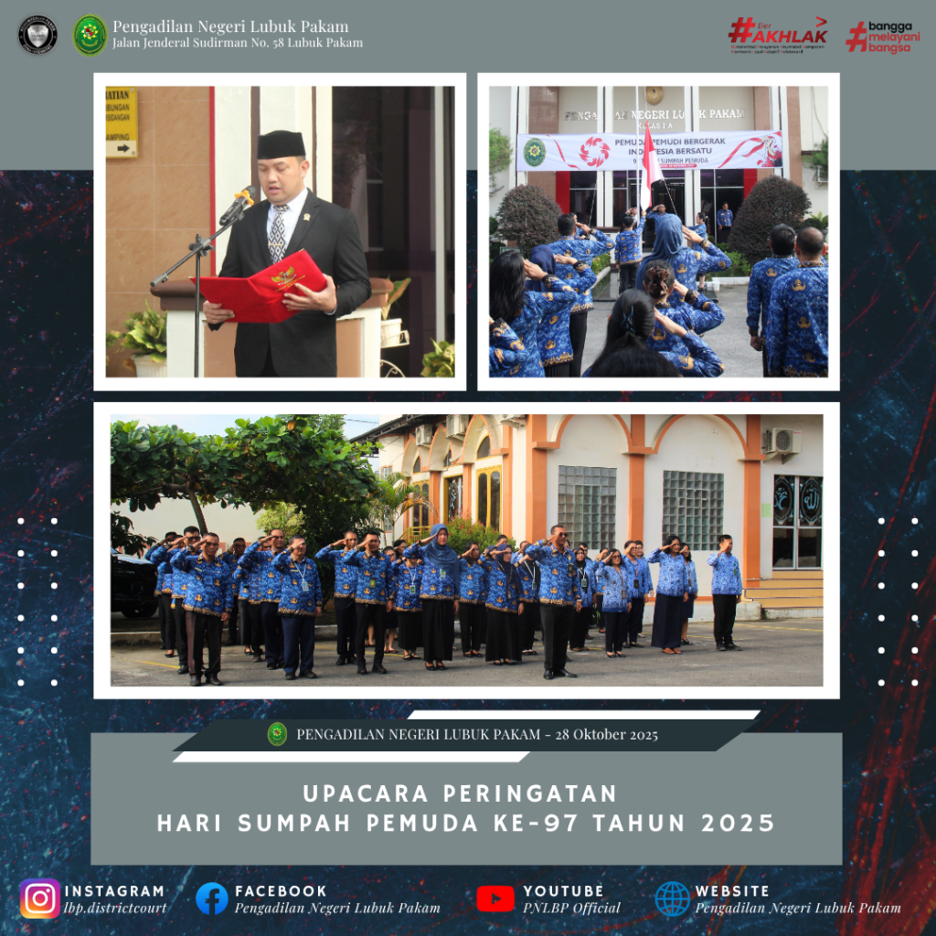 Momentum Hari Sumpah Pemuda ini menjadi pengingat bahwa kekuatan bangsa lahir dari persatuan, tekad, dan komitmen bersama. Pengadilan Negeri Lubuk Pakam menegaskan komitmennya untuk terus memberikan pelayanan hukum yang transparan, akuntabel, dan berkeadilan sebagai bentuk nyata pengabdian kepada masyarakat dan negara.