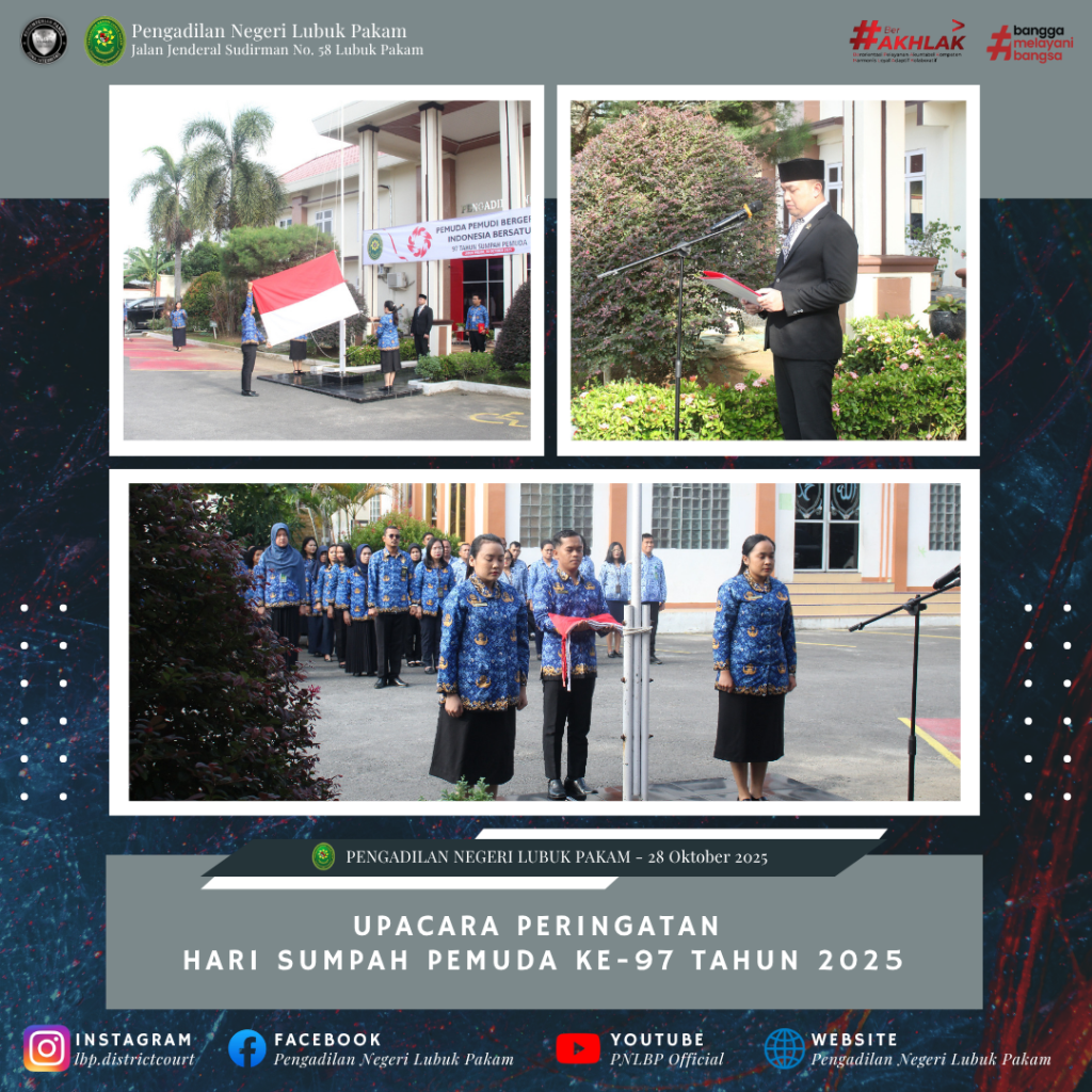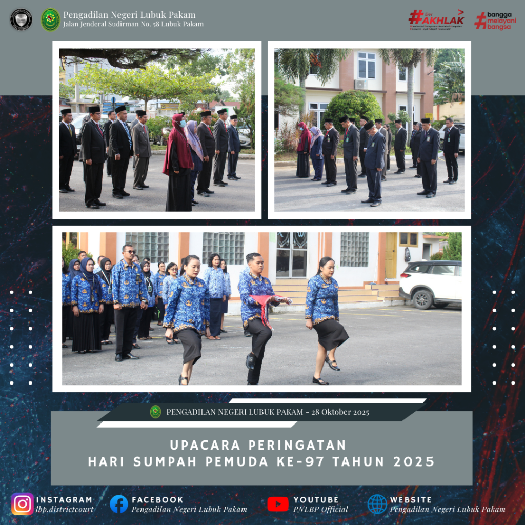 Lubuk Pakam, 28 Oktober 2025 – Pengadilan Negeri Lubuk Pakam melaksanakan Upacara Peringatan Hari Sumpah Pemuda ke-97 Tahun 2025 yang berlangsung dengan khidmat di halaman kantor Pengadilan Negeri Lubuk Pakam. Bertindak sebagai Pembina Upacara adalah Wakil Ketua Pengadilan Negeri Lubuk Pakam, Bapak Imam Santoso, S.H.