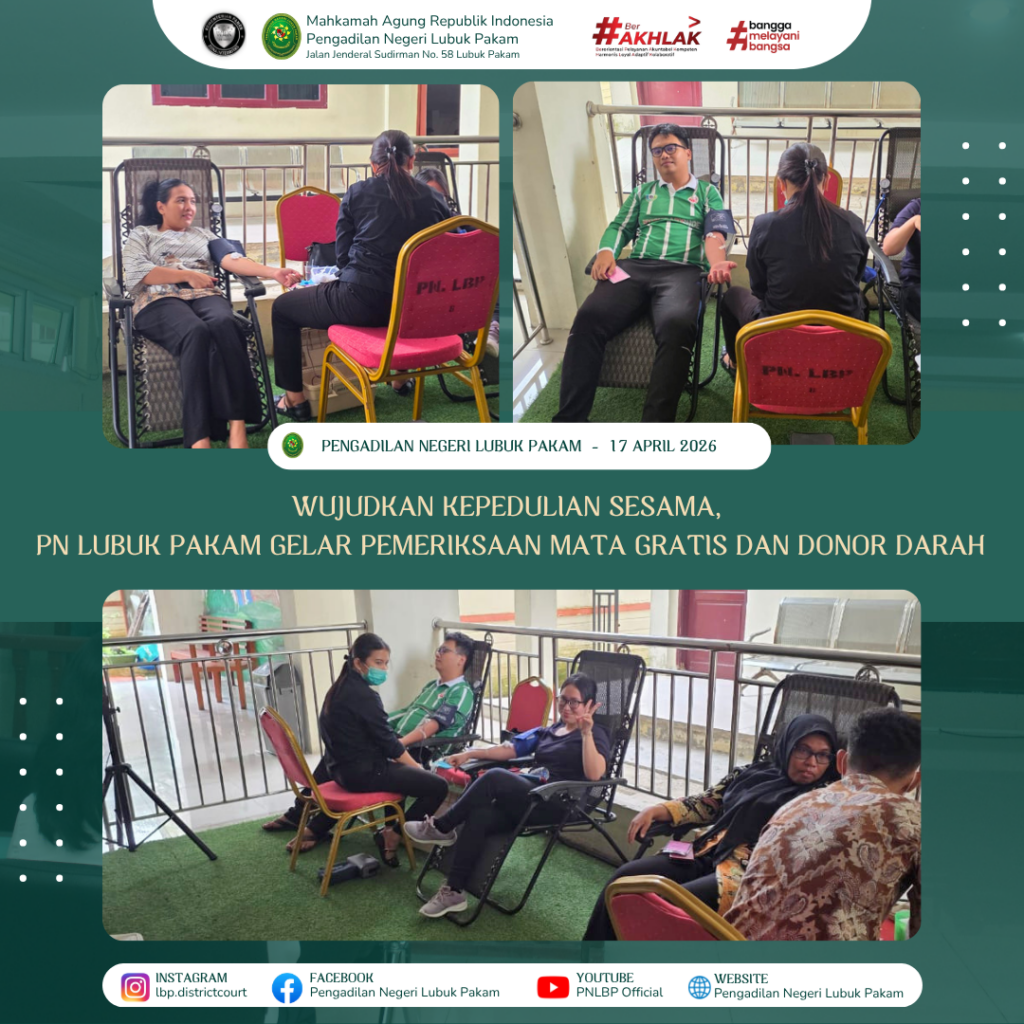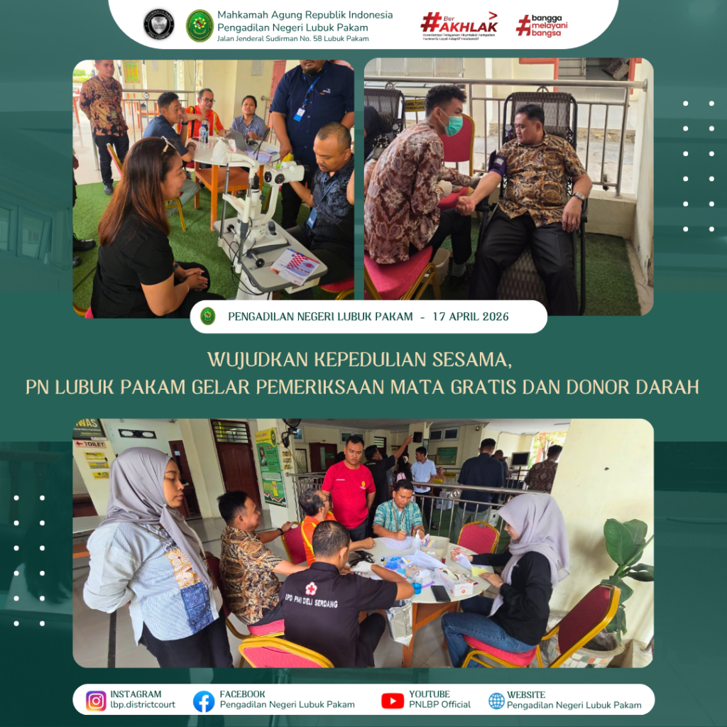 Lubuk Pakam, 17 April 2026 — Pengadilan Negeri Lubuk Pakam tidak hanya fokus pada pelayanan hukum, tetapi juga menunjukkan kepedulian terhadap kesehatan dan kemanusiaan. Bertempat di Ruang Tunggu Terbuka, keluarga besar Pengadilan Negeri Lubuk Pakam antusias mengikuti rangkaian kegiatan pemeriksaan mata gratis yang bekerja sama dengan Rumah Sakit Mata SMEC, sekaligus aksi donor darah pada Jumat (17/04).